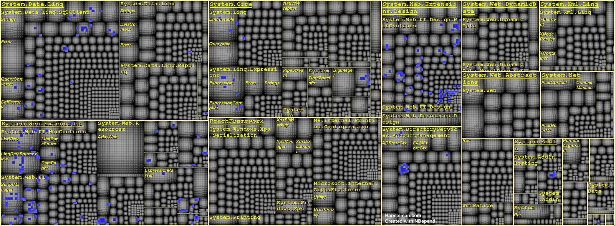 VS2008 and .Net 3.5 SP1 Beta - Should You Fear This Release? May 12, '08 Comments [23] Posted in ASP.NET | ASP.NET Dynamic Data | ASP.NET MVC | Learning .NET | Musings | Screencasts Sponsored By The Beta of .NET 3.5 and VS2008 SP1 is out. I'm sure everyone is blogging the heck out of it, so I'll try to add my own specific kind of value. There's fixes, many improvements (some subtle, some dramatic), and some new technology. Should You Fear This (Beta) Release? Maybe a little bit. Don't be afraid of the new assemblies or the bug fixes, I have found them to be very good and have no stability problems, but this Service Pack Installer might cause you some trouble in this beta, especially if you already have beta stuff installed over the top of VS2008RTM (the original version). It'll be correct when it releases later this summer. Now, if you're going to decide to install a Beta of a Service Pack, do read the ReadMe and ScottGu's post. Go ahead, I'll wait here. OK, if you're already running some beta stuff, like the Silverlight Tools for Visual Studio, you'll want to uninstall that FIRST, otherwise you'll get an error and be upset. This will also be figured out when the SP actually releases, but be warned. In this release, I have found the Progress Bar is wonky on XP and 2k3. It might say failed, and then succeed. Watch for the final message, not the bar. This will be fixed. Be aware also that it can be a long-ass install so get a coffee and pillow. On the developer side, this is much more than just a "tightening of the screws" release, as it also kind of breaks a few rules and introduces some new stuff I've been personally waiting for. What's New? ASP.NET Dynamic Data, ADO.NET Data Services ("Astoria"), ADO.NET Entity Framework (LINQ to Entities) are all additive. ScottGu has an extensive post detailing all the interesting bits. Here's my explanation on ASP.NET Dynamic Data and why you might care. I've been doing talks around on ADO.NET Data Services, sharing my thoughts on how its RESTfulness relates to ASMX/SCF Web Services and WS-*.*, and I'm going to dig deeper into it this year because I think it's pretty sweet, especially if Ayende and I (mostly him) get it running over NHibernate. The ADO.NET Entity Framework can be plugged in underneath both ASP.NET Dynamic Data and ADO.NET Data Services, so taken as a whole, the data story is starting to be a lot clearer and more useful and I'm continuing to work/push for all this stuff over POCO (Plain ol' CLR Objects) whenever possible and/or appropriate. For this release I've personally recorded seven (whew!) How-To Videos on ASP.NET Dynamic Data and the Dynamic Data Samples can be downloaded here. They videos and samples are short, sweet and to the point. I'm also hoping to do more integration-style videos showing all this stuff working together in something of a larger context. There's also a bunch of fixes like VS2008 starts faster and the IDE is snappier in spots, the WPF Designers are beefed up, and a bunch of editor/designer bugs have been squashed. Don't Mess With My GAC, Dude! UPDATE: Patrick Smacchia, who certainly knows his product better than I, has posted a follow up with more detailed information about what's changed in .NET 3.5 SP1. On the .NET 3.5 side of things, since this is an SP (Service Pack), yes, some stuff goes in your GAC and gets changed. However, the changes are completely additive. That means if an API's method signature has changed, that's a bug that we need to fix. It will be a fully compatible service pack release. It shouldn't break any of your existing code. There's roughly 50 new or modified types throughout or about 80 to 100 if you count Dynamic Data. On the WPF side, there's a bunch of new stuff in System.Windows.Effects that will make WPF people happy. There's a new WebBrowserControl in System.Windows.Controls that's like "whew! about time!" as well as new DataBinding support in System.Windows.Data. When folks tell me that things have changed, I personally don't always take their word for it, and would rather dig in and find out for myself what's changed in what assemblies. As far as I know there are four major tools for doing Assembly Differences (some have been added since I blogged about Assembly Differences last year): Libcheck - Over three years old, obscure, command-line, confusing, but still useful. I used this when diffing .NET 2.0 and 3.5 a while back. Framework Design Studio - A recent tool by Krzysztof Cwalina, a personal hero of mine, along with his helpers Hongping Lim and David Fowler, it has both a GUI and a command-line option. BitDiffer - This new tool from Greg Ennis is very polished and includes both a GUI and Command Line version. If it supported drag-and-drop it'd be even better. Unfortunately it crashed while I was trying to diff these assemblies. NDepend - Last, but not least, a favorite tool of mine that I've blogged about and podcast about has been dramatically updated to do Assembly Diffs as well in a very cool way. The tool is very polished and lets you compare projects, dlls, supports drag and drop and is generally polished and wonderful, so I ended up using this tool. So, Libcheck is frustrating, FDS is close, but only creates a text-based report on what's changed, BitDiffer crashed, and while NDepend does have some weird painting issues, but I was able to create this diagram with NDepend: Here's a close up (you can get the whole picture by clicking on it). In this example I was hovering over a method that was blue, and got a tooltip indicating that a method has changed in that type. I created the graphic by getting the DLLs from the GAC on a .NET 3.5 machine and the DLLs from a .NET 3.5 SP1 machine. Then I put them in two different folders on a machine that *did not have .NET 3.5 on it* to avoid any wackiness. Then I ran this Code Query Language (CQL) query: SELECT METHODS WHERE CodeWasChanged The results of that query were displayed in a number of ways, the most interesting one bei